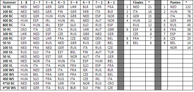 Nederland ijzersterk in eigen land. Tijdens een subliem georganiseerd kortebaan EK te Eindhoven heeft de Nederlandse ploeg onder leiding van Technisch Directeur Jacco Verhaeren een fantastisch optreden verzorgd. Maar liefst 22 medailles (9-8-5), waarmee een tweede plaats achter de sterke Duitse ploeg werd gerealiseerd. Het is echter niet het aantal medailles wat tot tevredenheid stemt, doch de tijden en de scores op de middellange- en lange afstanden.